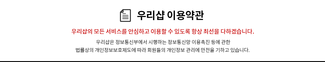 제 1 조 ( 목적 ) ② "이용자"란 "몰"에 접속하여 본 약관에 따라 "몰"이 제공하는 서비스를 받는 회원을 말합니다. ③ 회원 이라 함은 (주)더우리샵를 통하여 회원등록을 한 자로서, "몰"의 정보를 지속적으로 제공받으며, "몰"이 제공하는 서비스를 계속적으로 이용할 수 있는 자를 말합니다. ② "몰"은 약관의규제등에관한법률, 전자거래기본법, 전자서명법, 정보통신망이용촉진등에관한법률, 방문판매등에관한법률, 소비자보호법 등 관련법을 위배하지 않는 범위에서 이 약관을 개정할 수 있습니다. ③ "몰"이 약관을 개정할 경우에는 적용일자 및 개정사유를 명시하여 현행약관과 함께 몰의 초기 화면에 그 적용일자 7일 이전부터 적용일자 전일까지 공지합니다. ④ "몰"이 약관을 개정할 경우에는 그 개정약관은 그 적용일자 이후에 체결되는 계약에만 적용되고 그 이전에 이미 체결된 계약에 대해서는 개정전의 약관조항이 그대로 적용됩니다. 다만 이미 계약을 체결한 이용자가 개정약관 조항의 적용을 받기를 원하는 뜻을 제3항에 의한 개정약관의 공지기간 내에 "몰"에 송신하여 "몰"의 동의를 받은 경우에는 개정약관 조항이 적용됩니다. ⑤ 이 약관에서 정하지 아니한 사항과 이 약관의 해석에 관하여는 정부가 제정한 전자거래소비자보호지침 및 관계법령 또는 상관례에 따릅니다. ② "몰"은 재화의 품절 또는 기술적 사양의 변경 등의 경우에는 장차 체결되는 계약에 의해 제공할 재화·용역의 내용을 변경할 수 있습니다. 이 경우에는 변경된 재화·용역의 내용 및 제공일자를 명시하여 현재의 재화·용역의 내용을 게시한 곳에 그 제공일자 이전 7일부터 공지합니다. ③ "몰"이 제공하기로 이용자와 계약을 체결한 서비스의 내용을 재화의 품절 또는 기술적 사양의 변경 등의 사유로 변경할 경우에는 "몰"은 이로 인하여 이용자가 입은 손해를 배상합니다. 단, "몰"에 고의 또는 과실이 없는 경우에는 그러하지 아니합니다. ② 제1항에 의한 서비스 중단의 경우에는 "몰"은 제8조에 정한 방법으로 이용자에게 통지합니다. ③ "몰"은 제1항의 사유로 서비스의 제공이 일시적으로 중단됨으로 인하여 이용자 또는 제3자가 입은 손해에 대하여 배상합니다. 단 "몰"에 고의 또는 과실이 없는 경우에는 그러하지 아니합니다. ② (주)더우리샵는 회원으로 가입할 것을 신청한자 중 다음 각호에 해당하지 않는 한 회원으로 등록 합니다. 단, 회원등록을 위해 수집된 정보는 "회사"가 운영하는 "몰" 등의 회원 정보와 통합되어 관리됩니다. ③ 회원가입의 성립시기는 "몰"의 승낙이 회원에게 도달한 시점으로 합니다. ② 회원이 다음 각 호의 사유에 해당하는 경우, "몰"은 회원자격을 제한 및 정지시킬 수 있습니다. ③ "몰"이 회원 자격을 제한·정지 시킨 후 동일한 행위가 2회 이상 반복되거나 30일 이내에 그 사유가 시정되지 아니하는 경우 "몰"은 회원자격을 상실시킬 수 있습니다. ④ "몰"이 회원자격을 상실시키는 경우에는 회원등록을 말소합니다. 이 경우 회원에게 이를 통지하고 회원등록 말소 전에 최소한 7일 이상의 기간을 정하여 소명할 기회를 부여합니다. ② "몰"은 불특정다수 회원에 대한 통지의 경우 1주일이상 "몰" 게시판에 게시함으로써 개별 통지에 갈음할 수 있습니다. 다만, 회원 본인의 거래와 관련하여 중대한 영향을 미치는 사항에 대하여는 개별통지를 합니다. 1. 재화 또는 용역의 검색 및 선택 ② "몰"의 승낙이 제12조제1항의 수신확인통지형태로 이용자에게 도달한 시점에 계약이 성립한 것으로 봅니다. 1. 폰뱅킹, 인터넷뱅킹 등의 각종 계좌이체 ② 수신확인통지를 받은 이용자는 의사표시의 불일치 등이 있는 경우에는 수신확인통지를 받은 후 즉시 구매신청 변경 및 취소를 요청할 수 있습니다. ③ "몰"은 배송 전 이용자의 구매신청 변경 및 취소 요청이 있는 때에는 지체 없이 그 요청에 따라 처리합니다. ① 배송은 공휴일과 기타 휴무일 또는 천재지변 등 불가항력의 사유가 발생하면 그 해당 기간은 배송 소요 기간에서 제외됩니다. ② 배송과 관련하여 판매자와 구매자, 배송업체, 금융기관 등의 사이에 분쟁 등이 발생하면 관련 당사자가 해결해야 합니다. “몰”은 이에 관여하지 않으며 어떠한 책임도 부담하지 않습니다. ③ 구매확정이 이루어진 이후에 상품의 하자 등 결제대금의 환불사유가 발생하면 판매자와 구매자간 모든 분쟁은 거래 당사자인 판매자와 구매자가 해결해야 합니다. ④ 구매확정 기간 내에 구매자에게서 구매확정, 교환 또는 반품에 대한 의사표시가 없으면 “몰”은 해당 거래에 대하여 구매확정의 의사가 있는 것으로 간주하여 자동구매확정으로 처리(이하 “자동구매확정”)할 수 있습니다. 다만, 구매확정 기간 내에 구매자가 실제 상품을 수령하지 못했다면 구매자는 상품 미도착 신고를 할 수 있습니다. ⑤ 자동구매확정 처리가 완료되면, 회사는 보관 중인 결제대금 중 판매자에게 지급할 상품판매대금을 판매자가 지정한 방법으로 지급할 수 있습니다. ⑥ 자동구매확정이 이루어졌다면 구매자는 상품 미수령, 반품 등의 사유로 상품구매대금의 환불, 상품의 교환 등 모든 